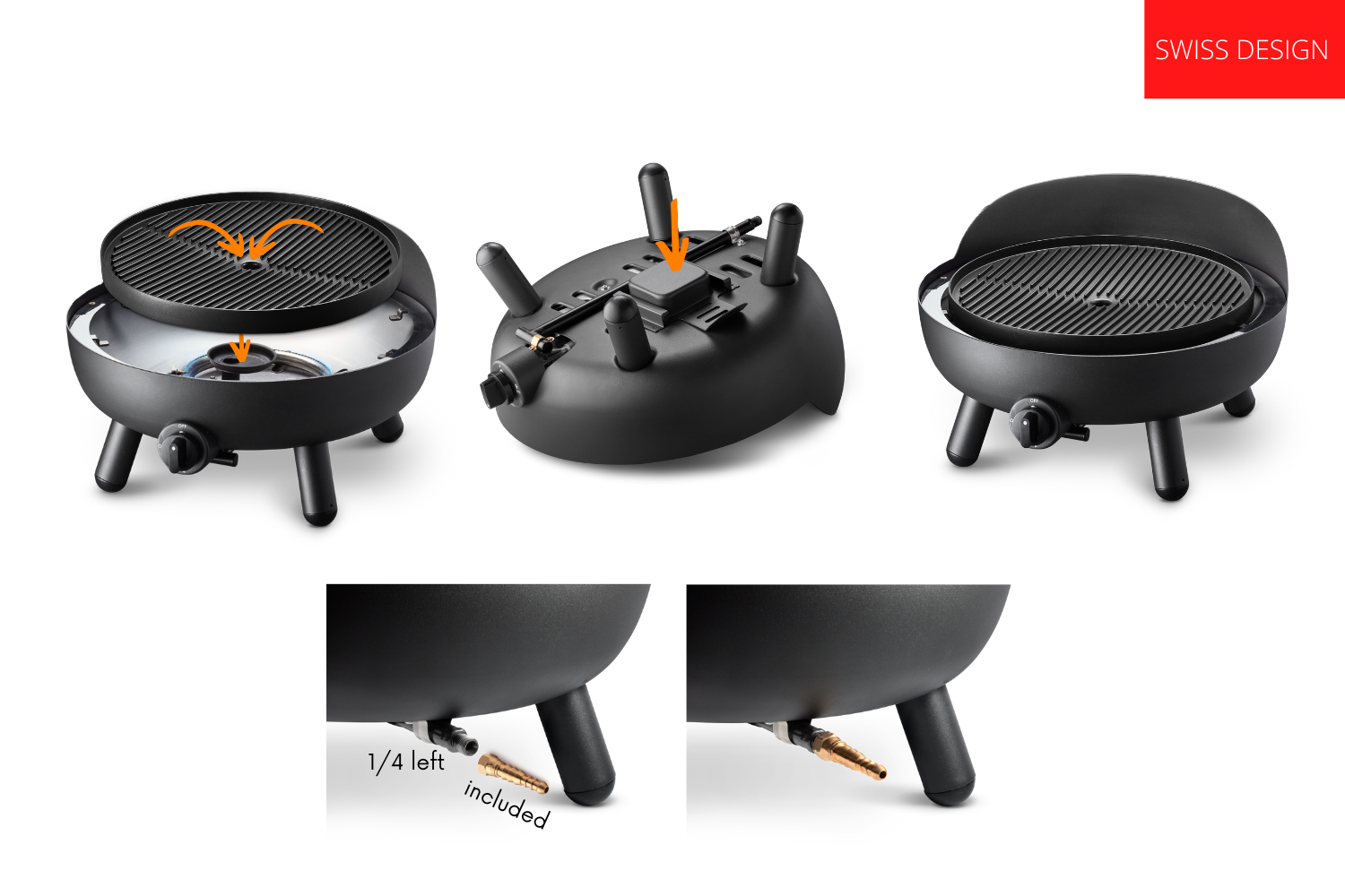 Vissez les pieds sur la base et placez la pierre à pizza et le dôme. Branchez ensuite le tuyau de gaz à l’aide du raccord ou directement sur le filetage gauche de 1/4″, et utilisez l’allumage automatique pour démarrer le four à pizza.